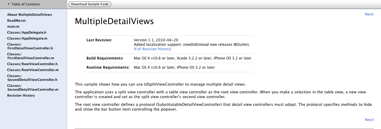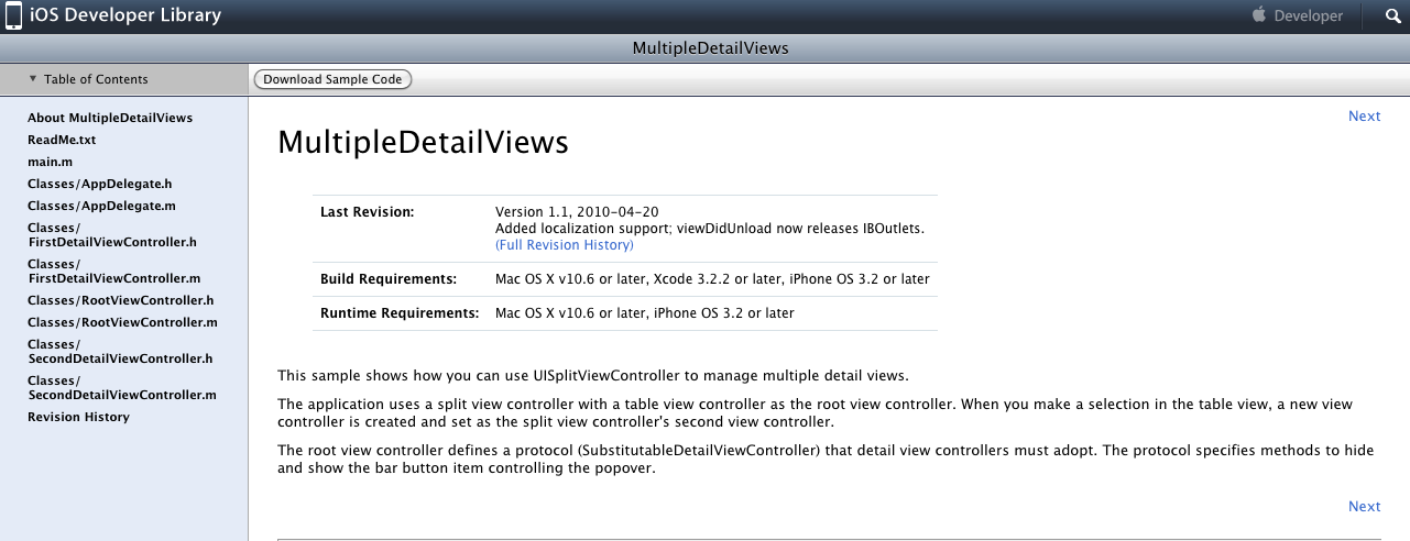 我必须为iPad制作一个应用程序,它需要一个类似UISplitViewController的视图,但顶部有额外的导航条。不幸的是,本机UISplitViewController不支持这一点。作为我想要的一个例子,考虑一下苹果文档站点,它看起来像: