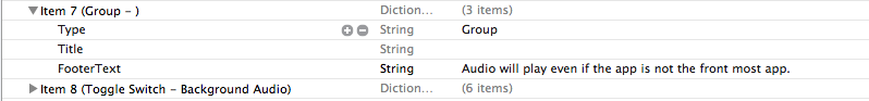 在Root.plist中,使用一些单词表示place。例如,对组页脚使用“脚注文本”。