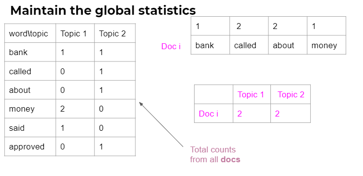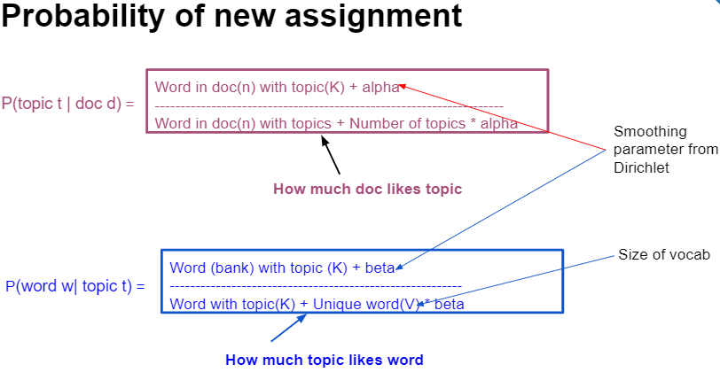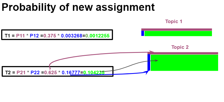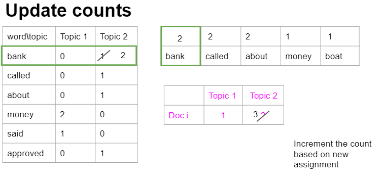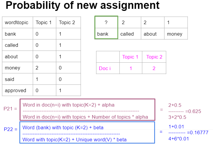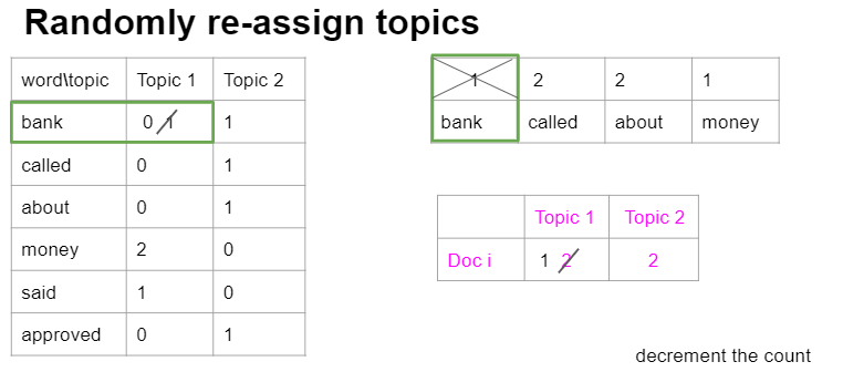 在此之后,我们将随机地从doc I (word bank with 1)中选择一个单词,并删除其指定的主题,并计算其新赋值的概率。