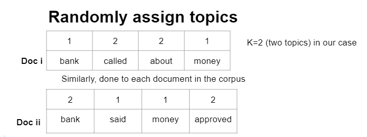 Step1:浏览每个文档,并将文档中的每个单词随机分配给K主题之一(K是事先选定的)
