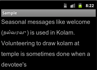 tv.setText("Seasonal messages like welcome (நல்வரவு) is used in Kolam. Volunteering to draw kolam at temple is sometimes done when a devotee's");发布于 2012-05-24 15:45:45