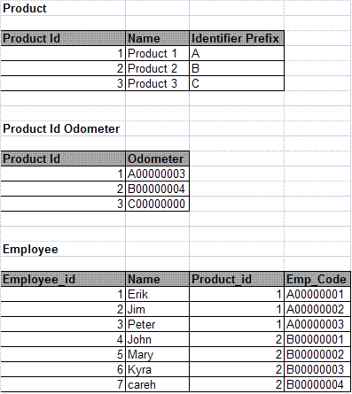 emp_code序列号可以从员工id和产品表中导出。显然,标识符前缀也可以从产品id中推断出来,因此实际上您的模式中有冗余列和冗余表。