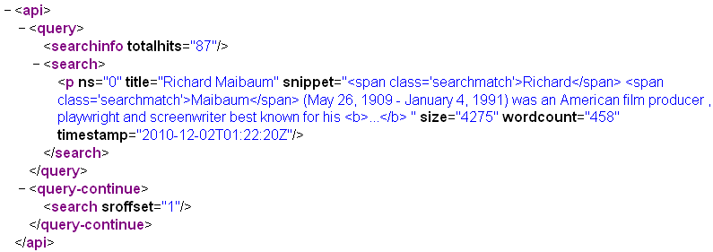 $url = "http://en.wikipedia.org/w/api.php?format=xml&action=query&list=search&srsearch=Richard Maibaum&srlimit=1";