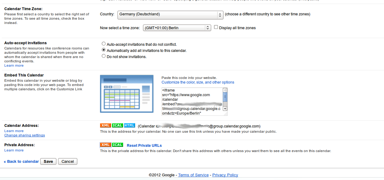您可以在日历细节的底部找到提要入口,称为"Private“,然后是"XML"按钮。
