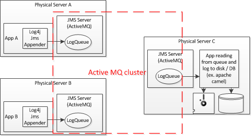 它是一个开源消息代理(与JMS兼容),能够在多台物理机器之间集群队列,而且ActiveMQ安装相当轻量级。您可以简单地在每个应用程序机器上安装一个ActiveMQ。然后,在日志服务器(图片中的物理服务器C)上,将有另一个ActiveMQ。您的应用程序将使用JMS (在这里读更多),您可以使用包含的阿帕奇骆驼从队列中读取数据,并在不需要为该任务编写应用程序的情况下写入文件或数据库。