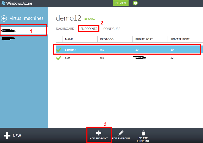 2. ,单击某个名称作为端点,放置80用于公共和私有端口
