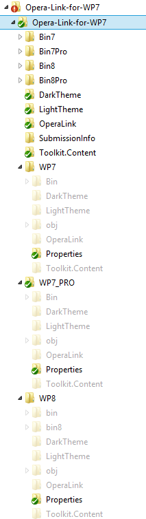 代码和输出文件夹(bin7,bin8,.)放在第一个子目录中。项目文件被放置在适当命名的子目录中。代码文件和资产被链接到单个项目中。“属性”文件夹中的文件对每个版本都是特殊的(其他GUID、名称、活瓷砖图标等)。这样,我必须点击一次F6和我的当前版本的所有XAP。(只需用一个小脚本来收集)