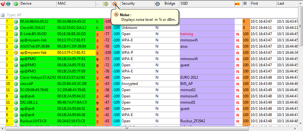 这不是我所预料到的,因为我非常清楚,我们使用同样的WiFi dongle检测与接入点相关的噪音水平,使用一个名为AirMagnet WiFi Analyzer PRO的专用软件。我甚至尝试从Jean下载并重新编译包,但类似的输出仍然显示在前面。