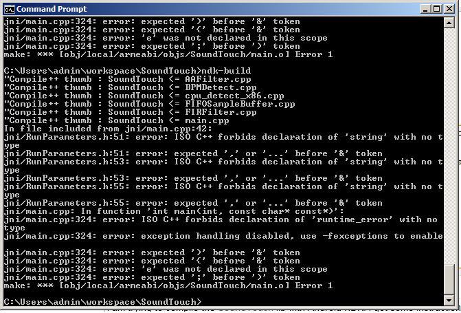 但是,当我尝试用ndk-build命令编译它时,它会显示SoundTouch lib的各种源文件中的错误,如下所示: