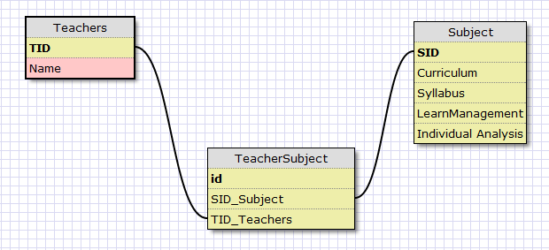 为了给您简要介绍我如何实现您的需求,我认为我们需要三个表,下面的SubjectsTeacher是连接这两个表的链接表。