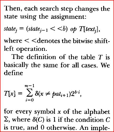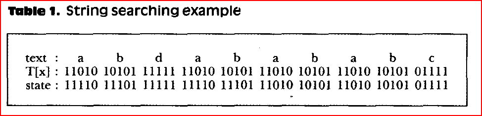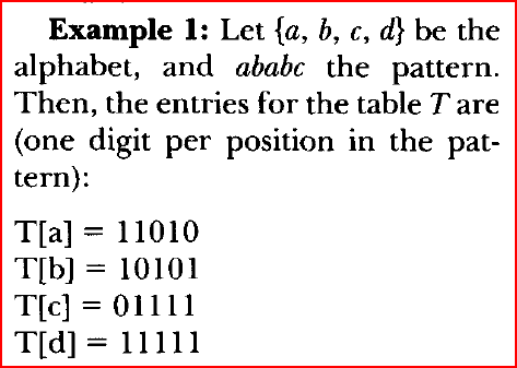 该算法的基本概念是用二进制表示匹配状态(在原始post中定义)。原文中的文章对此作了正式的解释;我将试着用口语化的方式这样做: