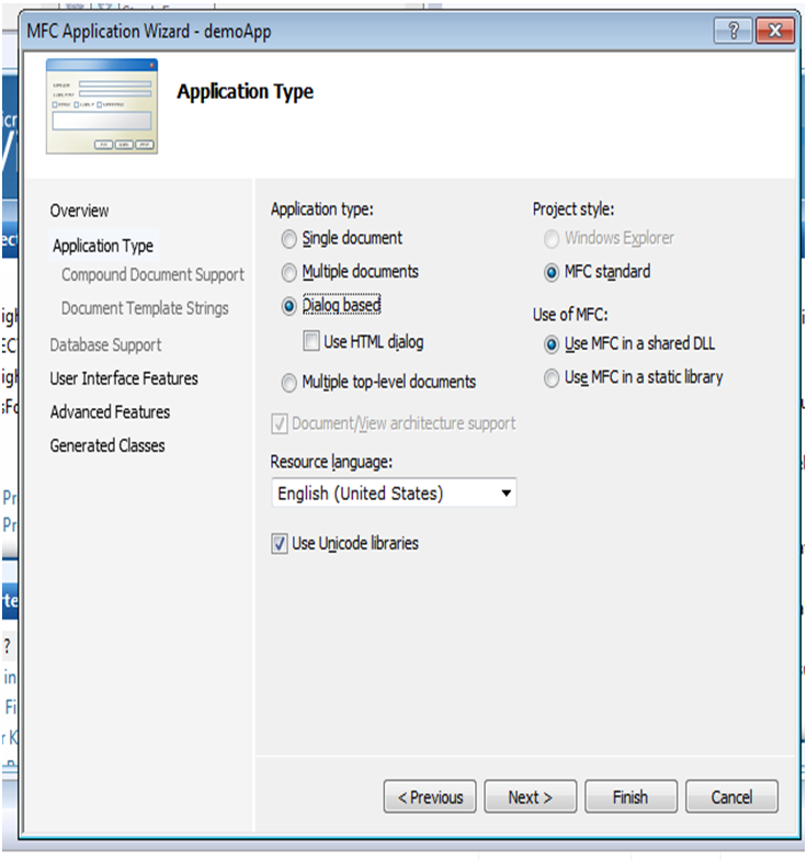 创建新的基于对话框的MFC项目时