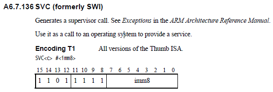 我正在为ARM Cortex-M3处理器开发一个自定义操作系统。要与内核交互,用户线程必须生成一个SuperVisor调用(SVC)指令(以前称为SoftWare中断)。ARM中这一指令的定义是: