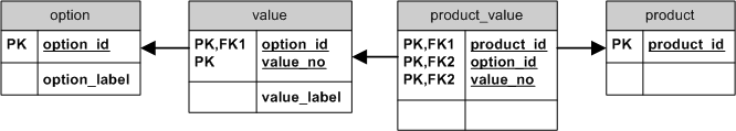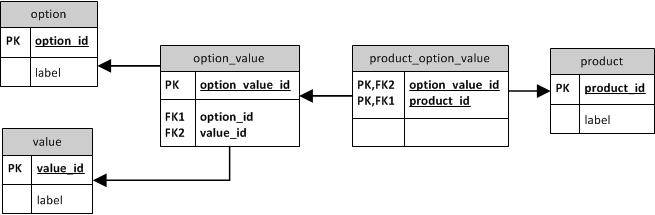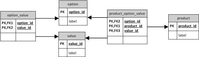 但是,该模型允许在多个选项之间共享单个值(例如,"red“可以是"color”和"size")。我猜这不是您想要的,在这种情况下,模型应该看起来类似于这样: