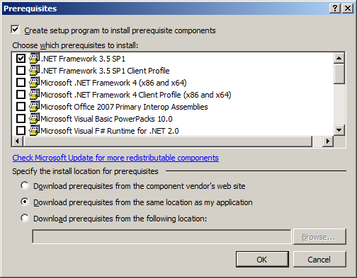 如果在installer项目属性上,我标记为“创建安装程序以安装先决条件组件”,并标记“从与我的应用程序相同的位置下载先决条件”.