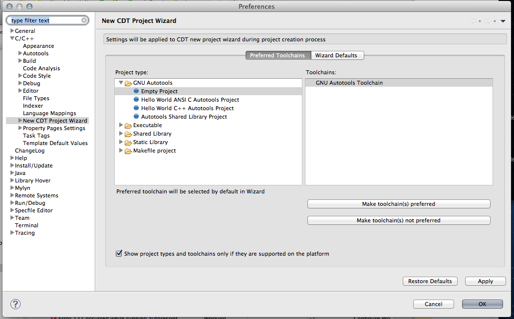 我今天安装了Eclipse (Eclipse用于C/C++开发人员版本: Juno版本构建id: 20120614-1722)。我想使用Xcode提供的Mac工具链。我正在运行OS (10.7.4) Xcode 4.3.2,并进行了检查,并安装了Command Line Tools。当我进入Eclipse -> Preferences ->新CDT项目向导->工具链时:我看到的只是GNU Autotools Toolchain,我没有看到"Mac工具链“。如何使Mac工具链出现在Eclipse中的工具链选择中?