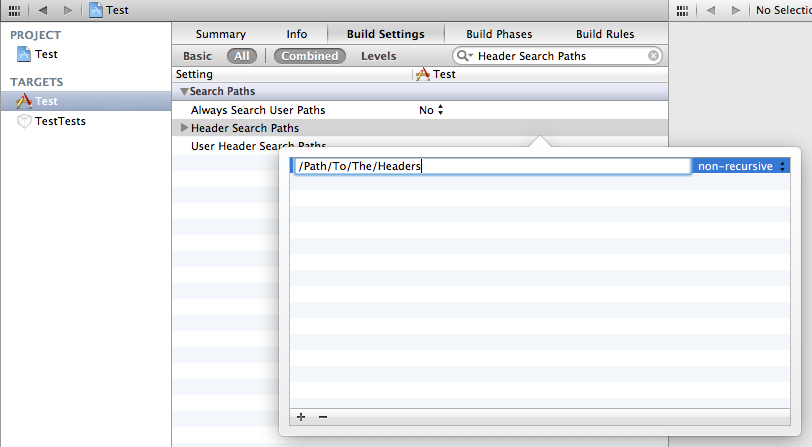 默认情况下,Xcode在项目自己的目录中递归地搜索标头。如果使用的是静态库,则需要使用lib的头文件,这些文件很可能位于其他地方。Xcode项目中有两个设置,允许您在编译期间指定搜索的其他路径: