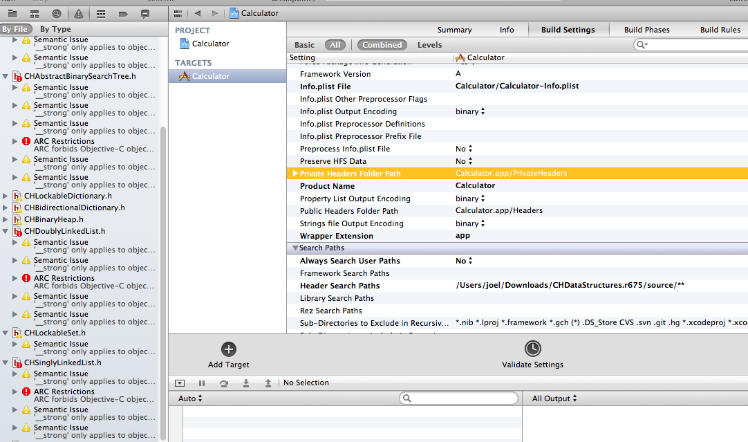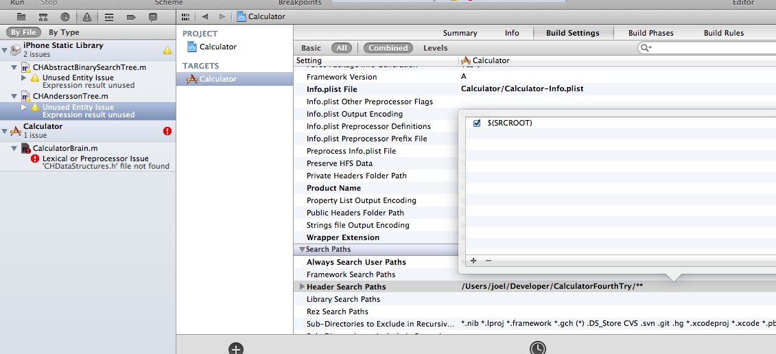 不幸的是,当我试图将头添加到我的项目中的类(例如,'CHDataStructures.h' file not found )时,我得到了一个Calculator.m错误。
