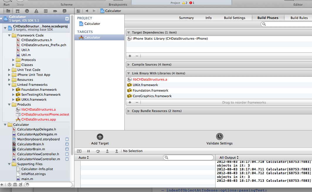 这里的新手,试图将CHDataStructures库添加到我正在处理的计算器项目中。我按照Linking a static library to an iOS project in Xcode 4上公认的答案做了这件事,最后得到了以下结果: