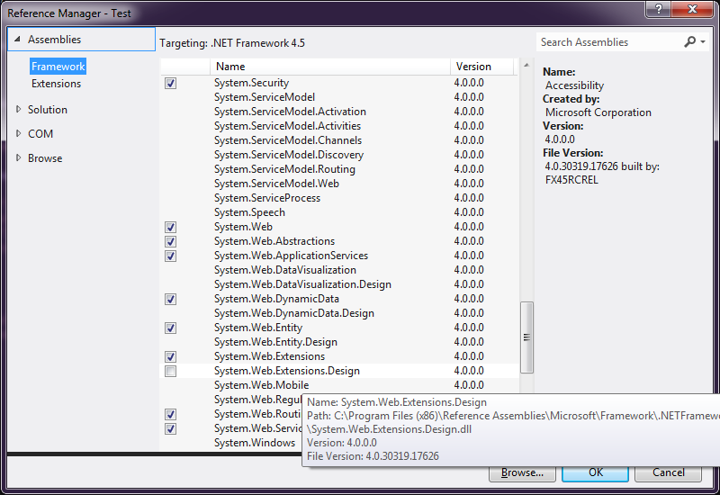 我试图在一个System.Transactions Visual 2012项目中添加对C#的引用,但是System.Transactions在框架程序集中是不可用的,在下面的屏幕截图中可以看到: