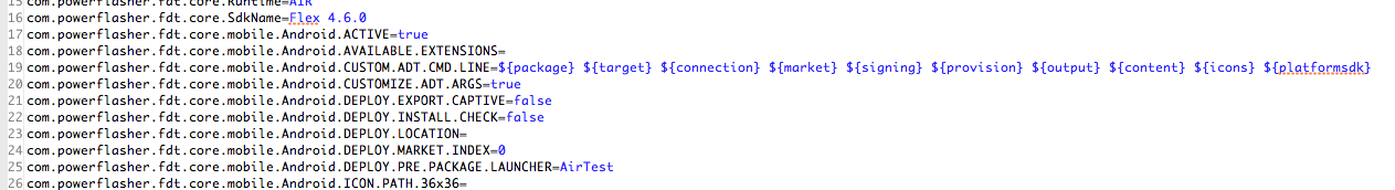 下面是“com.powerflasher.fdt.core.prefs”文件选择的屏幕截图。在它中,你将罚款所有用于航空出口的财产。要修改ADT参数,请查看: