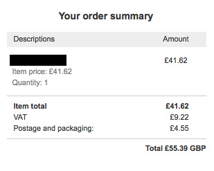 然后我会点击订购,贝宝将是这样,这是不正确的,因为总金额现在减少了1便士。这似乎是由税收的四舍五入造成的。