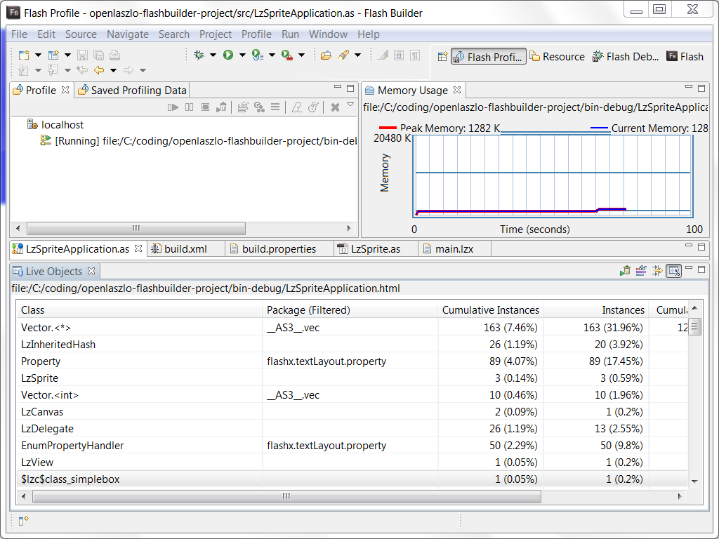 我刚刚学会了如何使用Flash的profile OpenLaszlo应用程序。讨论中提到的方法意味着将OpenLaszlo应用程序编译到SWF文件中,为Flex编译器启用调试选项。然后可以使用Flash对生成的SWF文件进行分析。
