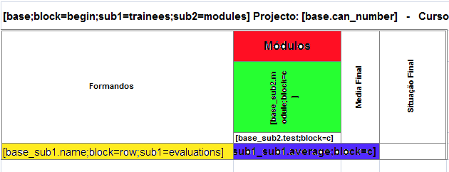 block=begin/block=end,方法是将TBS标记[base;block=beging;sub1=trainees;sub2=modules]替换为[base;block=row+row+row+row+row;sub1=trainees;sub2=modules],然后删除标记[base;block=end]。这可能不会改变目前的情况,但这将防止进一步意外的XML拆分。[base_sub2.module;block=c;p1]和[base_sub2.test;block=c;p1]。这将使TBS使用多个块,而不是一个带交替段的块。[base_sub2;block=c;p1]。模板示例: