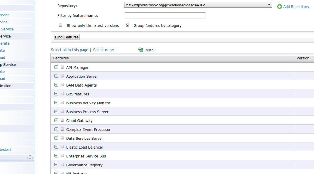 关于您有关特性安装的问题,基于WSO2 Carco4.0的产品支持按类别分组的特性安装。