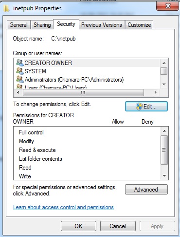 我试图向intpub文件夹添加相关权限,但无法添加新用户(ISUSR、网络服务或ASPNET)。