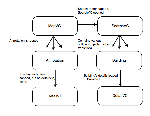 总之,MapVC包含多个注释,当点击相关的公开按钮时,就打开DetailVC。SearchVC是通过MapVC上的一个按钮访问的,它有一个Building表,它用相关的数据加载DetailVC,如下所示: