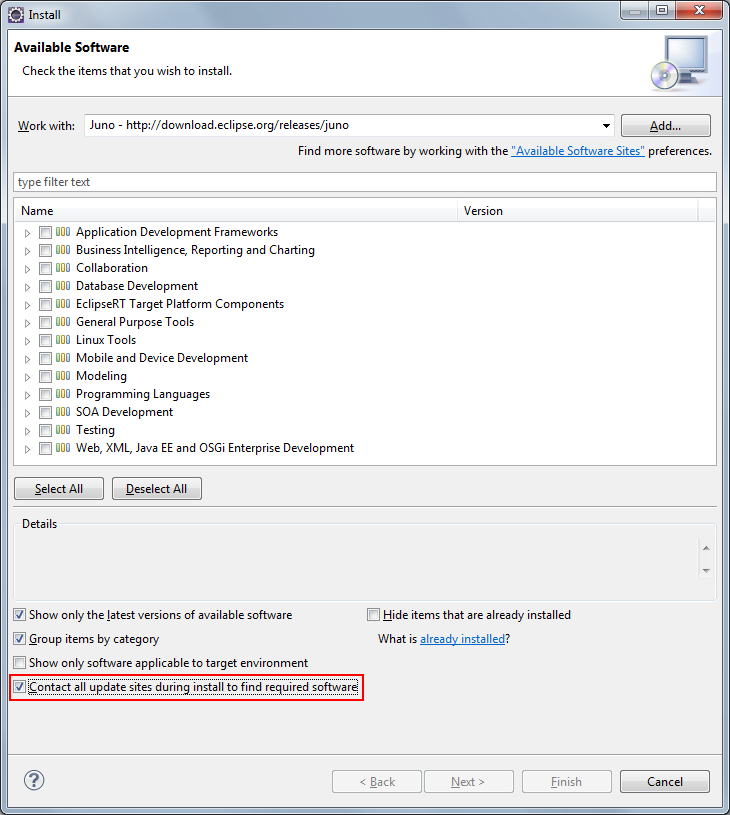 在“安装”对话框的底部,确保“在安装期间联系所有更新站点以查找所需的软件”被选中。