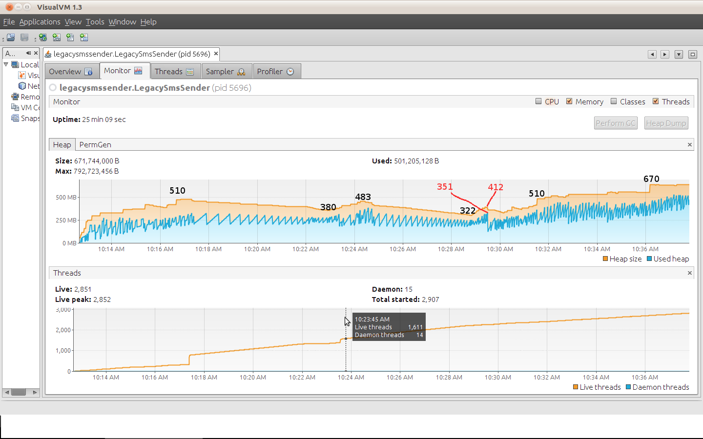 new MyThreadFactory("commonThreadPool"));最后,我运行了大约20分钟,我检查了VisualVM,我的内存使用量和实时线程计数一直在上升。有什么问题吗?
