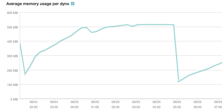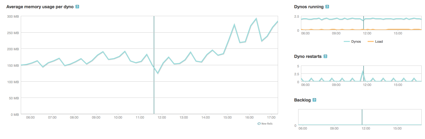 更新了:当这个屏幕转储(下面的一个)从新文物被拿走时。我计划每小时重新启动一次web dyno (每两个web dynos中就有一个)。因此,它没有达到500 of的崩溃级别,它实际上得到了一个sig锯模式。然而,这个问题根本没有得到解决,只有一些症状。如你所见,早上不那么忙,但下午更忙。我在11.30上传了一个很小的细节,它不可能影响到问题,即使它出现在统计中。