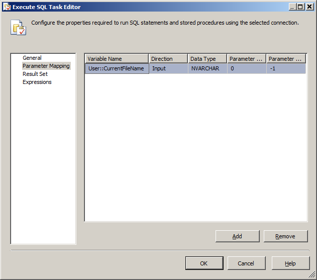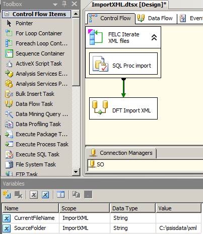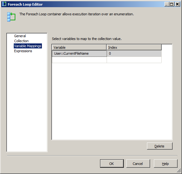 您需要根据您的方法定义1到2个变量。这两种类型都是字符串数据类型。我创建了SourceFolder和CurrentFileName。前者定义了文件的来源,并在这两种方法中使用。后者在ForEach循环容器中用于捕获“当前”文件。