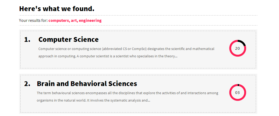 <td width="100%" class="major-description align-top">Computer science or computing science (abbreviated CS or CompSci) designates the scientific and mathematical approach in computing. A computer scientist is a scientist who specialises in the theory of computation and the design of computers. Its subfields can be divided into practical techniques for its implementation and application in computer systems and purely theoretical areas.</td>
