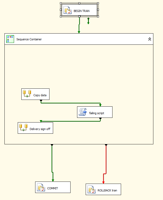 第二种实现事务的方法是使用SQL本机事务。在这里,您将有一个启动事务的执行SQL任务,然后是数据流任务,然后是提交事务的另一个执行SQL (当然还有另一个要回滚)。这里的问题是,我刚才提到的所有任务都必须使用相同的连接管理器,否则连接管理器上的retainsameconnection = True 将无法工作,因为SSIS和SQl server仍然将其视为分布式事务,即使它们不在同一台服务器上,而且您必须使用开始分布式事务,这再次需要分布式事务协调器。此外,我还记得分布式本机SQL事务在SSIS中不能正常工作。