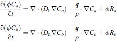 我有三个偏微分方程(PDE)和一个变量的解析解,如下所示。用这些方程求解\phi(x,y,t),p(x,y,t),C_{a}(x,y,t)和C_{b}(x,y,t),即空间和时间。