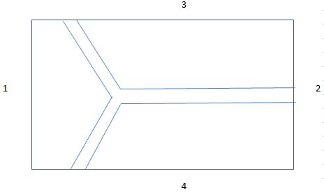 总畴尺寸为10 cm×5cm,y形子畴宽度为0.5cm。该子域的初始\phi为0.50,而在周围的矩阵\phi=为0.26。1 Pa和0 Pa的常数p分别保持在边界(1)和(2)处,对应于约10^-3m^-1的梯度。边界(3)和(4)上的p是由边界(1)和(2)之间的线性梯度确定的。C_{a} =2 mol ^-3和C_{b} = 0.2302 mol ^-3的常数C在边界(3)处保持不变,而在C_{a} =1 mol ^-3和C_{b} = 0.4603 mol m^-3处的浓度则保持不变。边界(1)的浓度由边界(3)和(4)之间的常数梯度决定,出口处设置一个对流通量边界条件$$(\frac{c}{ x} = 0)$$ (2)。