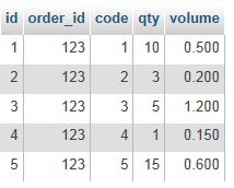 SELECT code, qty, volume