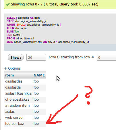 我有两张桌子:adhoc_item和adhoc_itemadhoc_vulnerability ahdoc_item与之相关。现在,adhoc_vulnerability可能有也可能没有附加一个漏洞(original_vulnerability_id)。