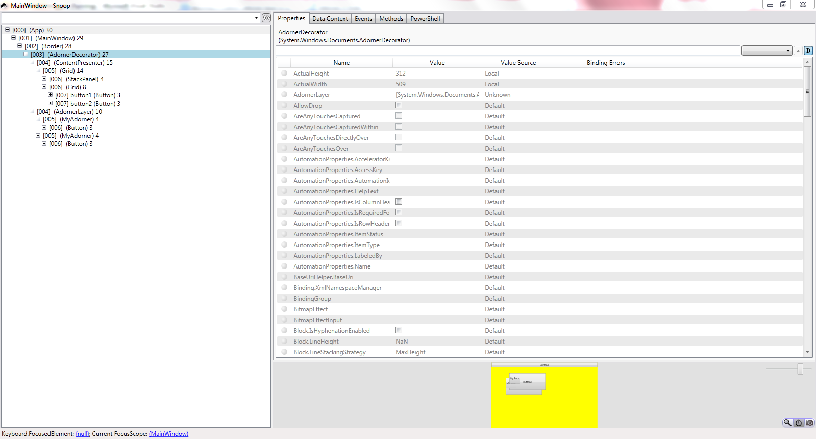 在下面的屏幕快照中,AdornerLayer被添加到AdornerDecorator中,Adorner (MyAdorners)被添加到这个AdornerLayer中。但是AdornerLayer是这样检索的,