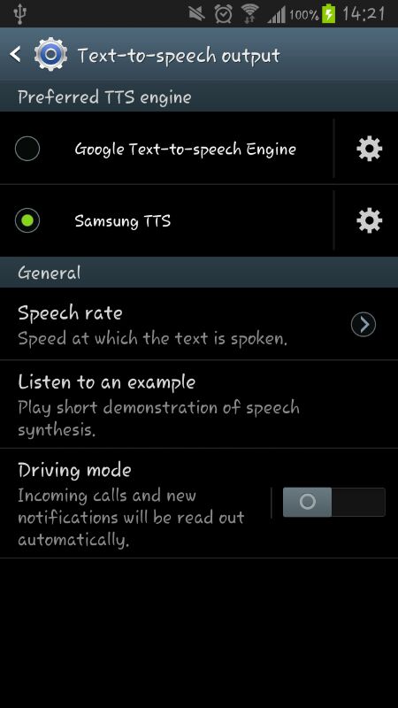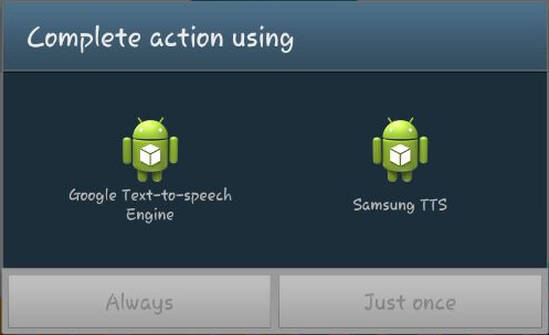 }它在使用2.2和2.3.x操作系统的三星设备上运行良好。如果需要的话,它会转到Google,但现在我已经尝试了三星Galaxy S3 ( 4.1.1),它默认安装了两个TTS (三星和谷歌),所以我得到了一个对话框,要求选择一个。
