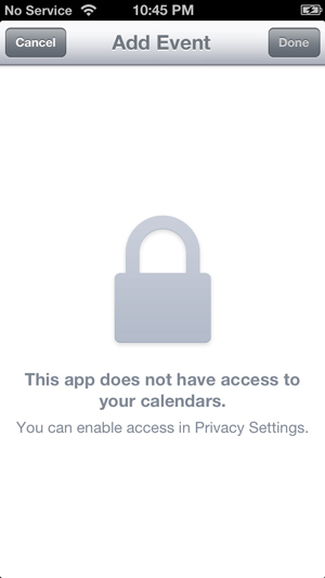 [self presentViewController:eventController animated:YES completion:nil];此在模拟器上运行良好,但我在电话(IOS6)上运行它时会收到以下错误消息:“此应用程序无法访问日历”