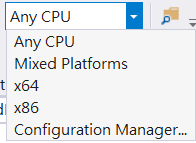 在我的示例中,转到Configuration 检查每个项目是否使用您正在构建的平台,例如,如果您使用Release模式发布并使用Any CPU,请将每个项目选中为Any CPU。