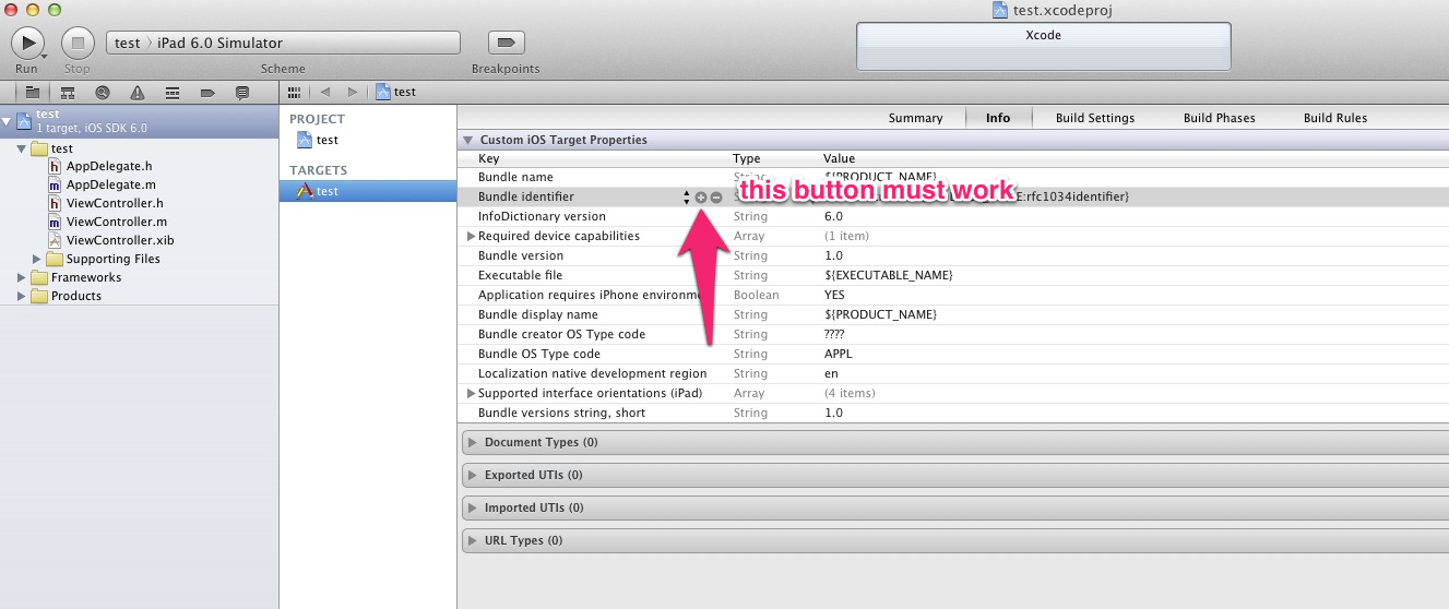 我使用Xcode 4.5并尝试向info.plist添加键(使用从下拉列表中添加行命令,或单击Plus按钮)。