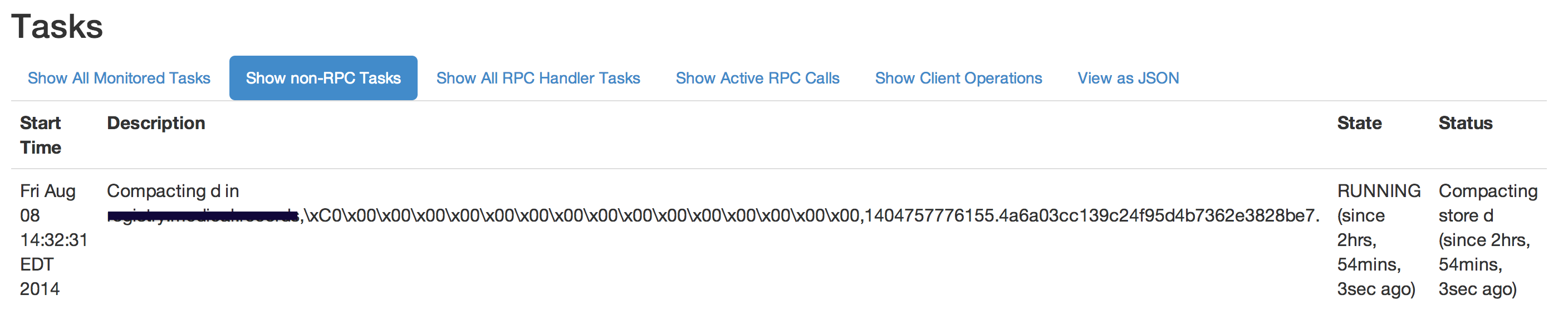 当开始压缩和HBase压缩的状态时,可以从:<hbase.master.ip>:<hbase.master.info.port>/dump,即10.4.4.40:60010/dump中收集到