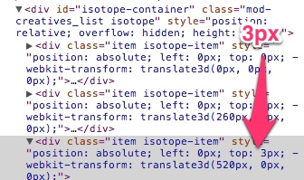 我们正在使用基于同位素/砖石的布局,目前我们的项目有以下问题:我们的同位素元素有一个边界,但是在同位素计算定位后,这个边界消失了。在element.style中,同位素设置top: 0px,而当我们手动调整值top: 3px时,边框再次正确显示。