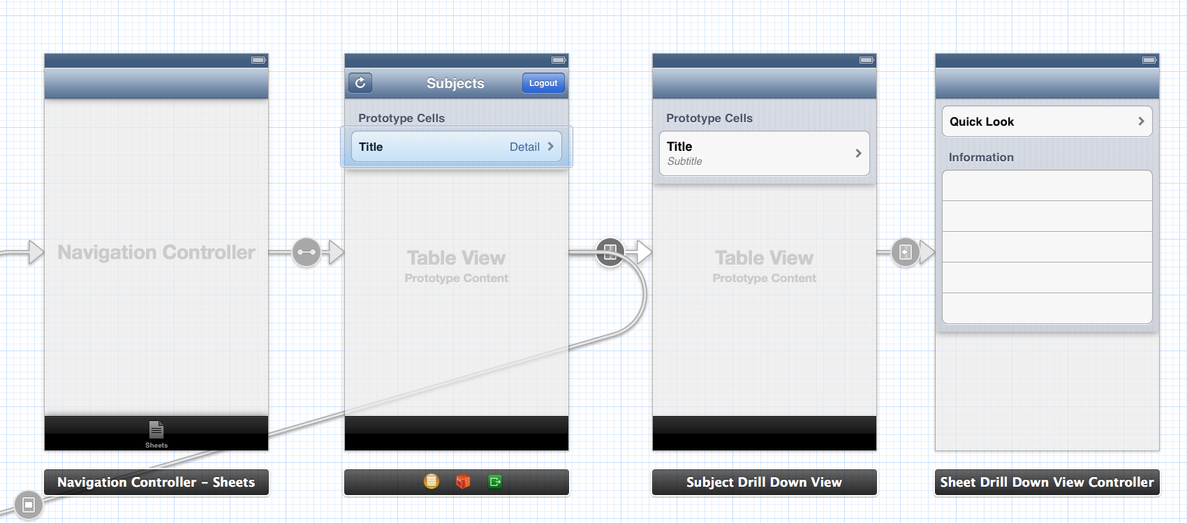 2012-11-14 20:24:54.487 MyApp[26266:c07] Unbalanced calls to begin/end appearance transitions for <SheetDrillDownViewController: 0xa1bb980>.下面是我的设置:初始视图->下一个视图(UITableView) ->最后一个视图(UITable)