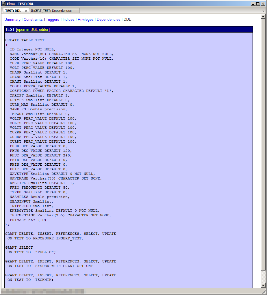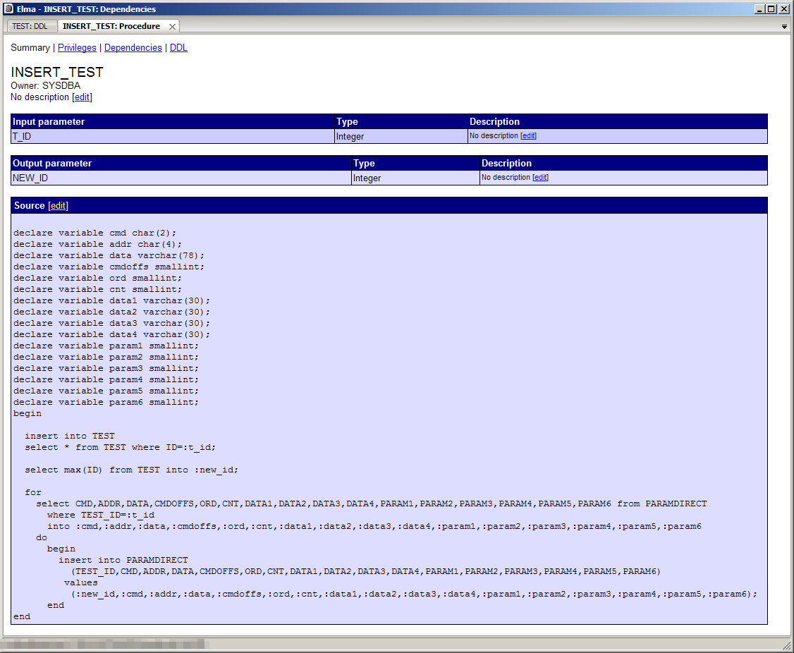 也许可以在db管理工具FlameRobin的以下屏幕截图中找到一些提示。它们包含存储过程INSERT_TEST和表测试的完整定义。